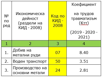 За илюстрация показвам извадка от таблицата. Както бе изяснено по-горе, трябва да търсите първите две цифри от вашия код по КИД-2008 в колоната, обозначена с жълто. ВАЖНО: Подреждането в таблицата не е по кодове, а по големината на коефициента на трудов травматизъм, ето защо е необходимо да прегледате всички редове / кодове (от първия до последния)!